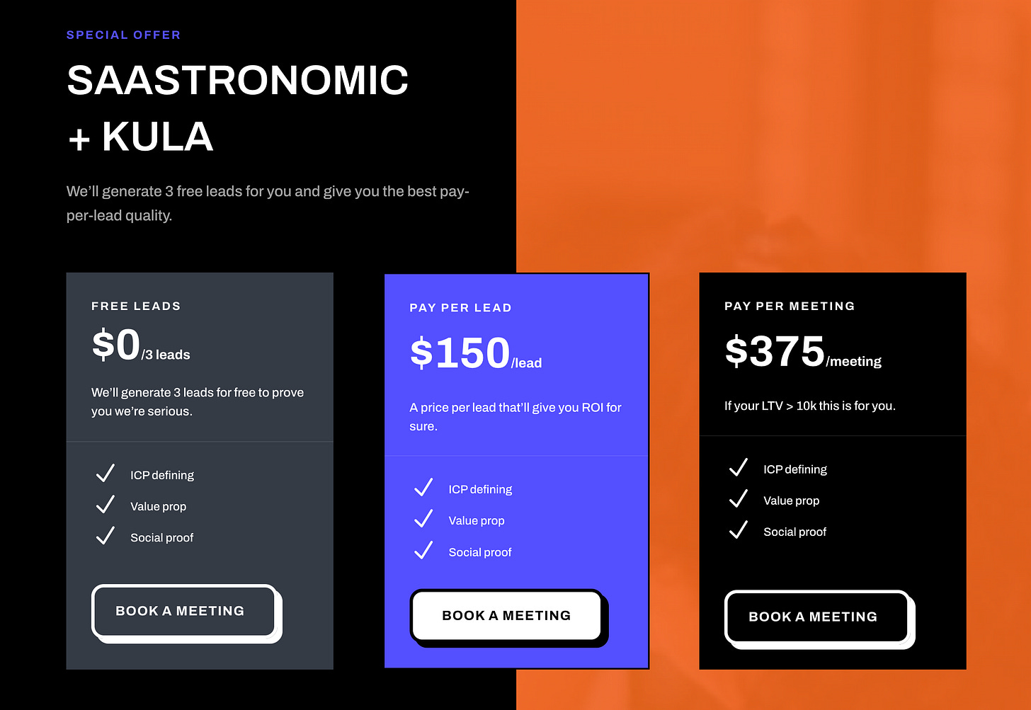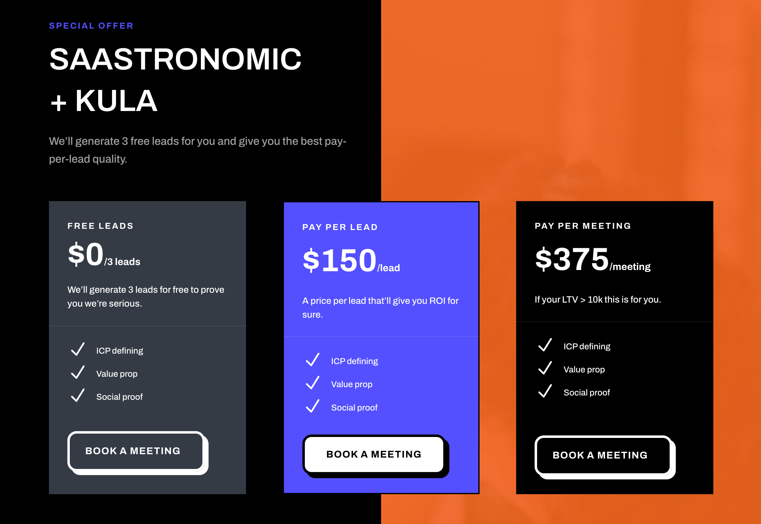 My company Saastronomic.com partnered with Kula to give you 3 free leads. After this, we'll run a 150/lead basis or 375/meeting. One of the best offers around.