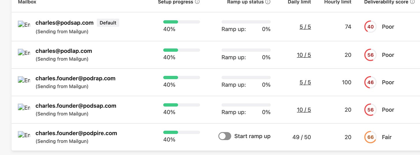 Warming up mailboxes again. Apollo has a warmup feature (shown over) I’ve disregarded for a while. They deployed it and removed it various times, and it seemed like an uncertain feature. They’ve kept it as of late, realizing it was useful to keep your sending score up. Any mailbox of mine with a score under 60% gets “warmed up”. Turning this on means my mailbox won’t send any outreach, but I’m willing to make the sacrifice for 2 weeks for my mailboxes to get healthy again.